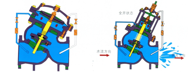 當(dāng)水泵啟動(dòng)后,出水壓力上升,水泵出水一方面產(chǎn)生推動(dòng)在閥瓣打開的力,一方面進(jìn)入控制室里膜片(活塞)的下腔。上腔的水與主閥出水口相連而泄掉,閥門在控制速度下緩慢開啟。